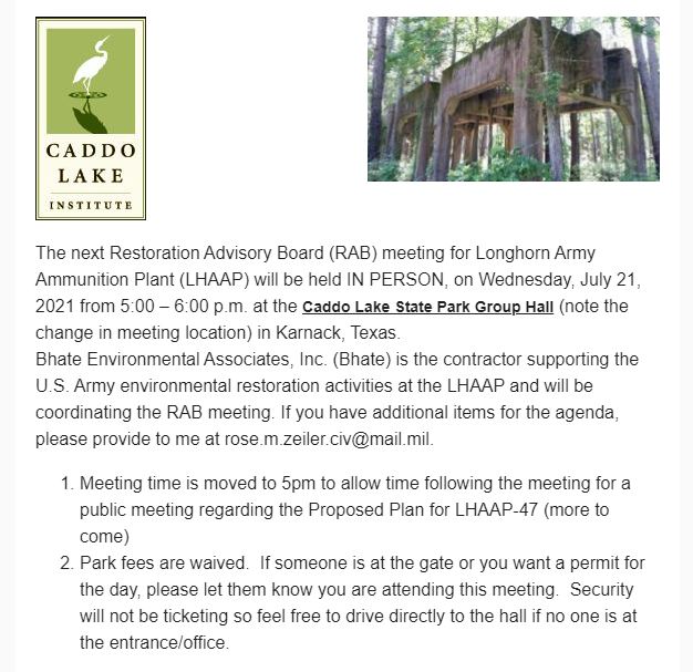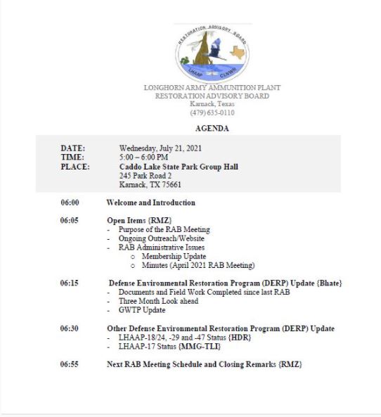 The next Restoration Advisory Board (RAB) meeting for Longhorn Army Ammunition Plant (LHAAP) will be held IN PERSON, on Wednesday, July 21, 2021