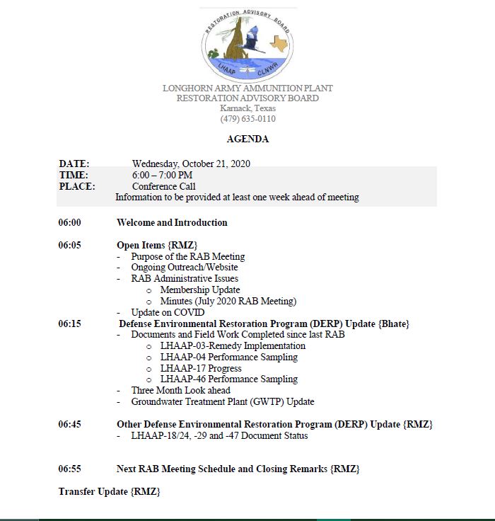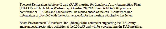 The next Restoration Advisory Board (RAB) meeting for Longhorn Army Ammunition Plant (LHAAP) will be held VIA CONFERENCE CALL, on Wednesday, October 20, 2021