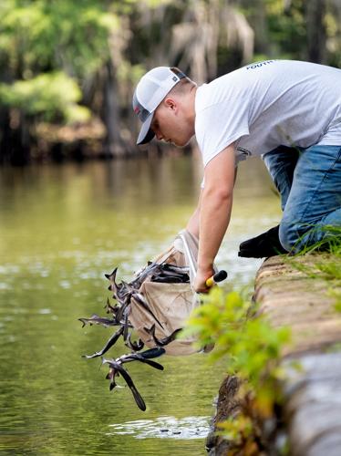 Caddo Lake welcomed almost 5,000 new occupants to its waters after the Natchitoches National Fish Hatchery released juvenile paddlefish into Caddo Lake from the main boat dock at Caddo Lake State Park in Karnack, TX on June 23, 2022.